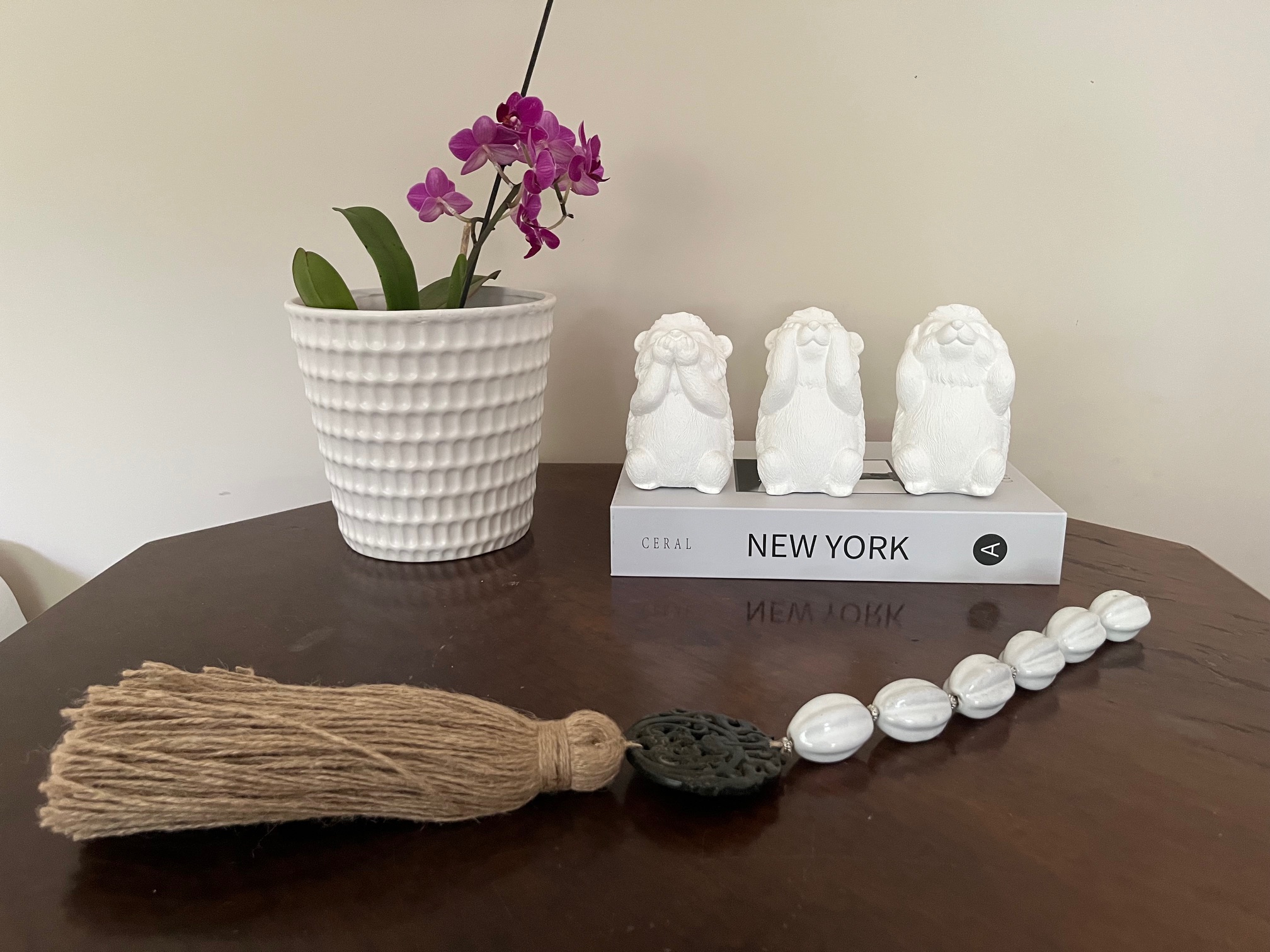 Enfeite de mesa - Cerâmica branca com Jade marrom e tassel rústico cru